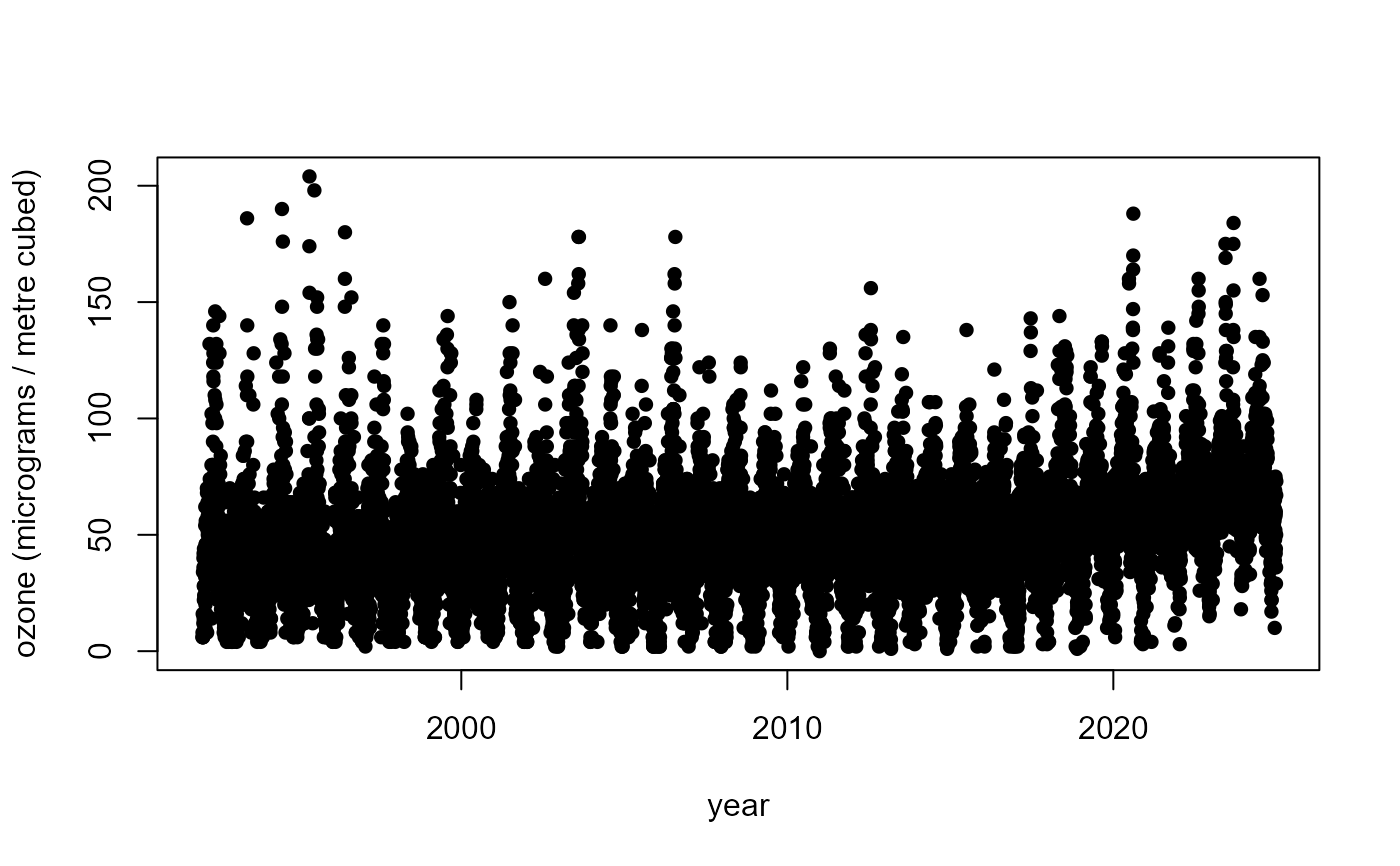 Date: with class"Date"in the formatYYYY-MM-DD.Year: Values in 1992-2024.Ozone: daily maximum ozone level in \(\mu\)g/m\(^3\).