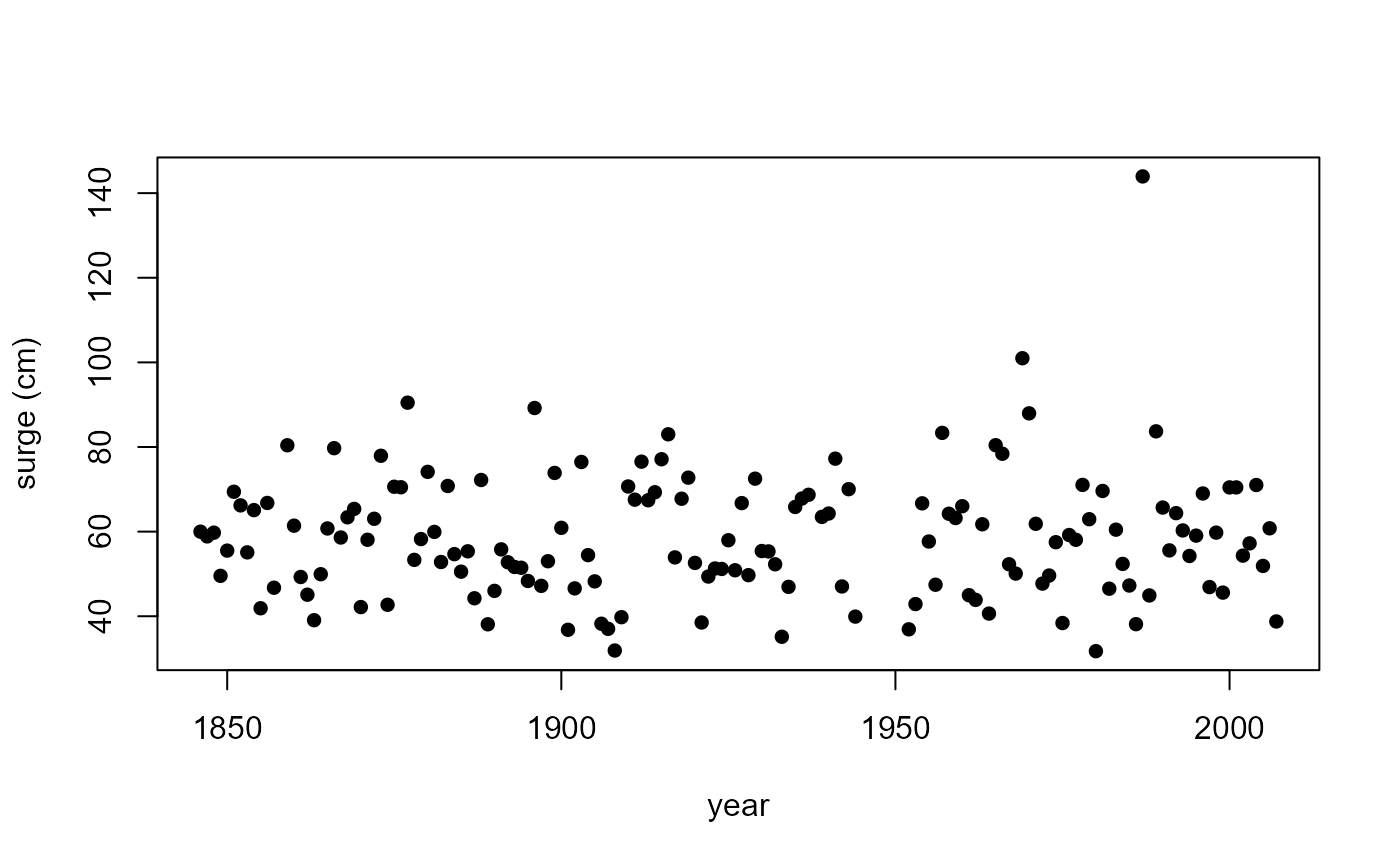 ylab = "surge (cm)", xlab = "year", pch = 16)