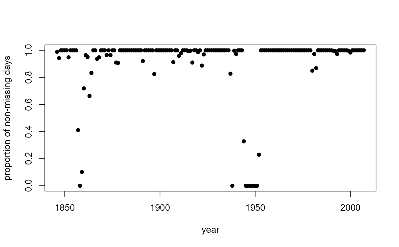 ylab = "proportion of non-missing days", xlab = "year", pch = 16)