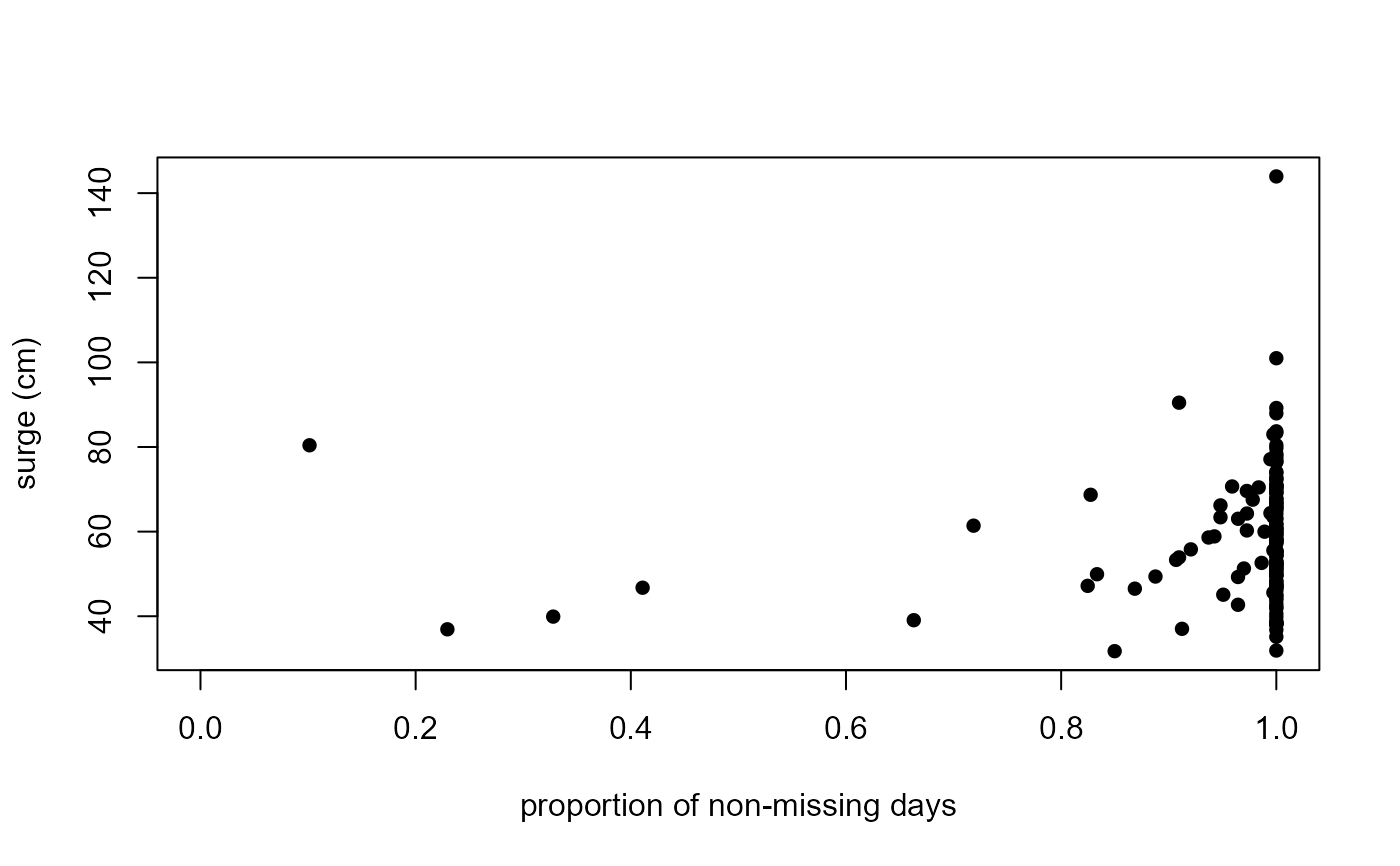 ylab = "surge (cm)", xlab = "proportion of non-missing days", pch = 16)