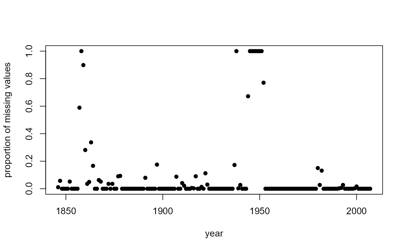 ylab = "proportion of missing values", xlab = "year", pch = 16)