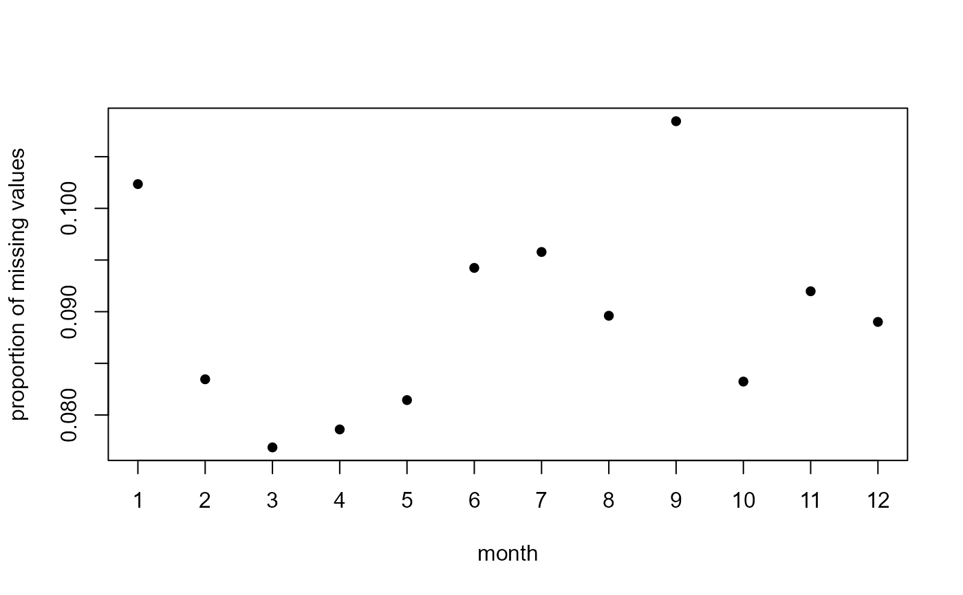 ylab = "proportion of missing values", xlab = "month", pch = 16)